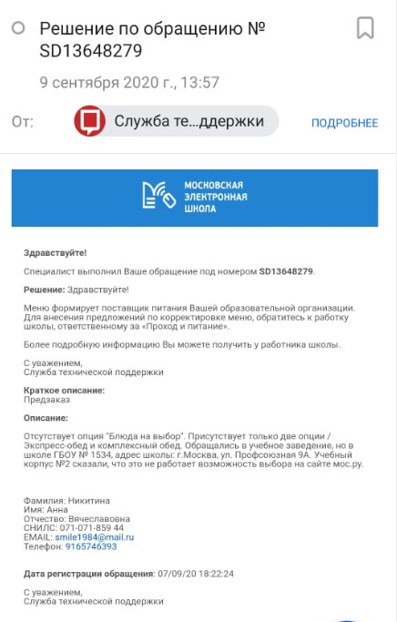 На ваше обращение сообщаем, что на основании информационного письма от поставщика питания «Школьник-ЮЗ», 7 сентября классные руководители разослали информацию родителям обучающихся о том, что по техническим причинам заказ на вариативное питание, а именно «Обед перечень из блюд на выбор», в ближайшее время на портале mos.ru будет не доступен. В этом письме сообщается, что для заказа доступны: платные комплексы «Примерного 24-х дневного меню для обучающихся 1-4 и 5-11 классов в общеобразовательных учреждениях».